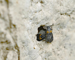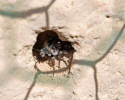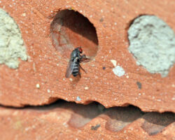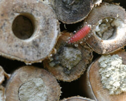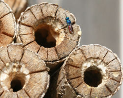 19% unserer Wildbienen nisten in vorhandenen Hohlräumen. In der Natur finden sie diese in Form von verlassenen Käferfrassgängen in Holz, in hohlen Stängeln, Felsspalten, Erdritzen und Schneckenhäuschen. Die Käferfrassgänge lassen sich durch Bohrungen in Hartholz imitieren. Wichtig ist, auch Bohrlöcher mit kleineren Durchmessern von 2 bis 4mm anzubieten, die meisten der üblichen Nisthilfen sind mit 5 bis 8mm leider nur auf grössere Arten (v.a. zwei häufige Mauerbienenarten) ausgerichtet. Die Bohrungen sollten sauber ausgeführt werden, die Löcher frei von Splittern und Spänen sein. Etwa das gleiche Artenspektrum, das in Hohlräumen im Holz nistet, nutzt zum Nestbau auch dürre hohle Pflanzenstängel. Diese können gebündelt in horizontaler Lage angeboten werden. Es ist darauf zu achten, dass das hintere Stängelende verschlossen ist. Und auch hier sollten verschiedene Durchmesser vorhanden sein.