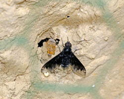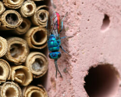 An den Wildbienennisthilfen werden auch andere Insekten zu beobachten sein. Mehrere solitäre Wespenarten nutzen die gleichen Strukturen zur Anlage ihrer Nester. Interessant sind auch die vielen Gegenspieler, die sich an den Nistplätzen einfinden. Verschiedene Kuckucksbienen, Goldwespen, Keulenwespen, Gichtwespen, Taufliegen, Trauerschweber, Ölkäfer etc. profitieren von der vorhandenen Brut ihrer Wirtsarten und führen uns so ökologische Zusammenhänge vor Augen.