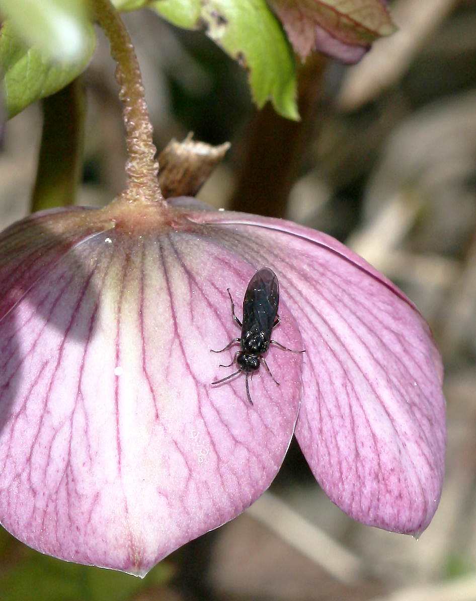 Weniger an den Nieswurzblüten, dafür mehr an deren Blättern ist die Christrosen-Blattwespe (Monophadnus latus) interessiert. Im März schlüpfen die glänzend schwarzen Wespen aus dem Boden und versammeln sich auf Christ- oder Lenzrosen (die Stinkende Nieswurz ist weniger beliebt) um sich zu paaren. Die Weibchen legen danach ihre Eier in die Blattstiele. Daraus schlüpfen winzige Larven, die anfangs unauffällig auf der Blattunterseite Pflanzengewebe abschaben. Mit dem Wachstum der Larven nimmt aber auch ihr Appetit zu, so dass mit der Zeit die Blätter durch Lochfrass erheblich beschädigt und entstellt werden. Zum Verpuppen kriechen die Larven in den Boden unter ihre Futterpflanze und im folgenden Frühjahr beginnt der Kreislauf wieder aufs Neue. Bei grösseren Blattwespenpopulationen können die Christ- und Lenzrosen stark in Mitleidenschaft gezogen werden und sind nach wenigen Jahren so geschwächt, dass sie eingehen. Wenn man aber naturnah gärtnert und den Pflanzen die Selbstaussaat gönnt, ist das durchaus zu verkraften. Denn die Christrosen-Blattwespen legen ihre Eier bevorzugt an ältere Pflanzen, junge werden weniger beachtet. So verjüngt sich der Helleborusbestand im Garten stetig und das Schubladendenken bezüglich Schädling oder Nützling erübrigt sich einmal mehr.