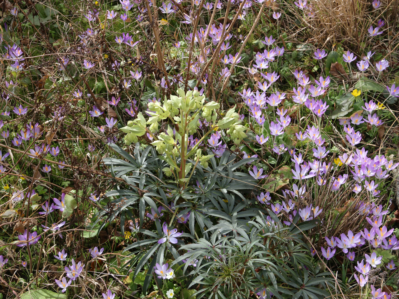 Typischer Flühblüher-Aspekt im Naturgarten mit Stinkender Nieswurz, Krokussen und Winterlingen.