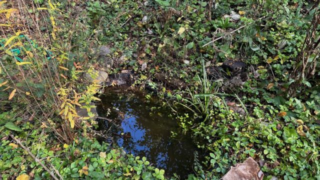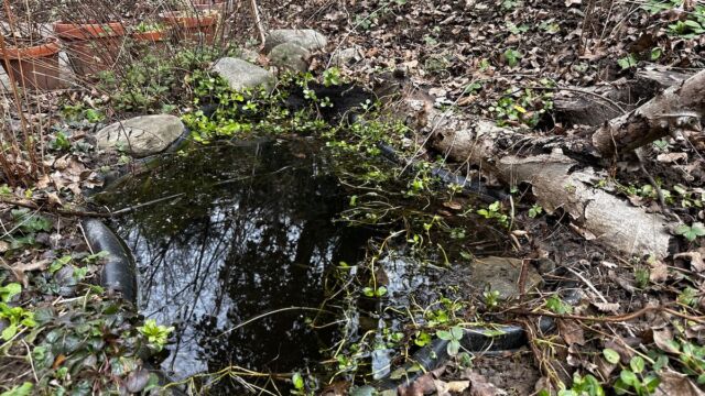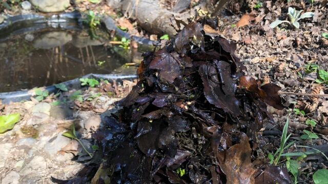 Sofern in der Nähe Bäume oder Büsche sind, lohnt es sich den Schalenteich über den Winter mit einem Gitter abzudecken, damit nicht zu viel Laub reinfällt. Alternativ kann Ende Winter auch ein Teil des Laubs herausgefischt werden.