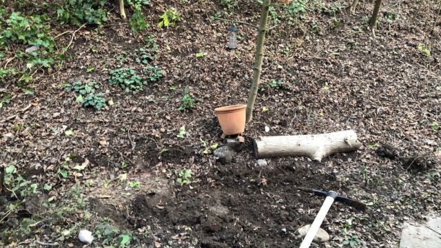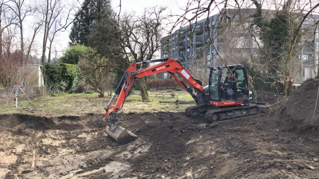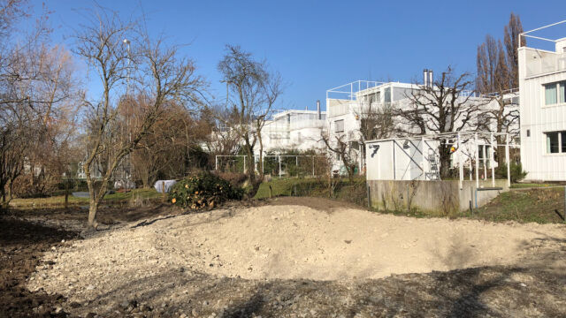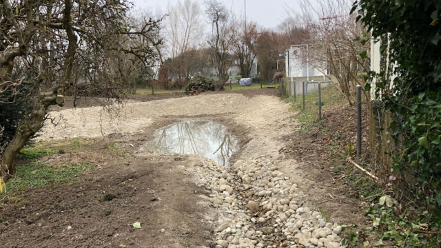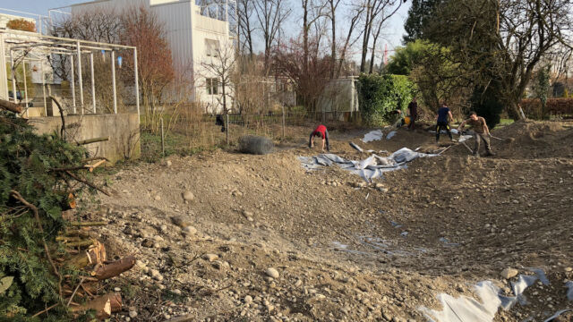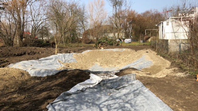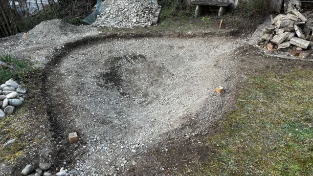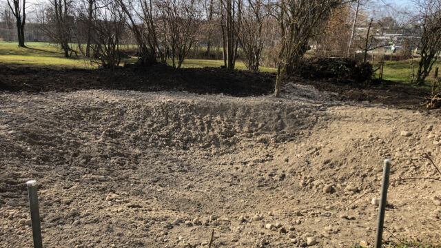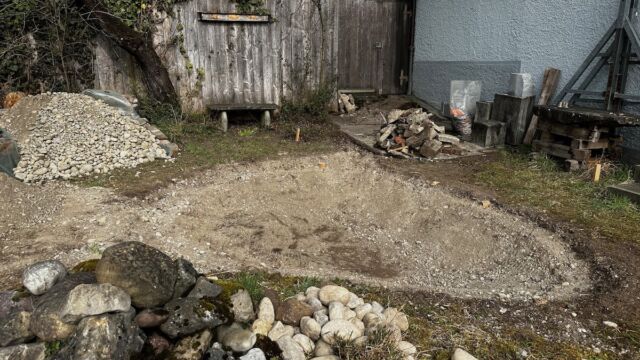 - Teichfläche ausheben. Falls möglich den Aushub nicht entsorgen, sondern im Garten umverteilen.