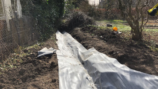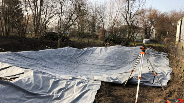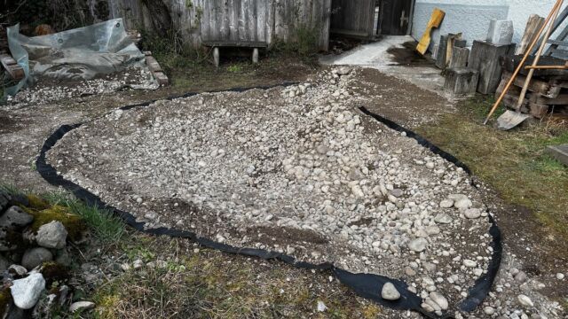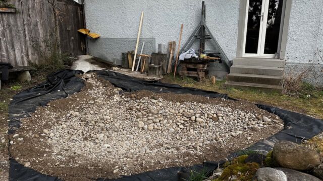 - Boden mit einer dünnen Sand-Kiesschicht bedecken und darauf achten, dass keine spitzen Steine/Wurzeln vorhanden sind, die Löcher in die Teichfolie machen könnten. Zur Sicherheit kann auch mit einem Wurzelvlies gearbeitet werden.