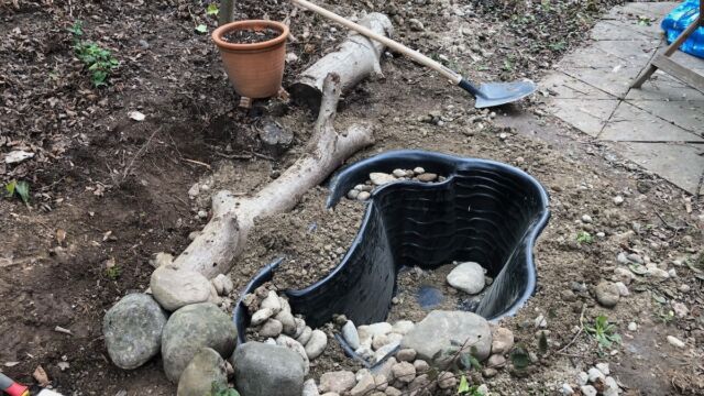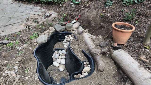 - Teichschale einsetzen und rundherum mit Erde/Kies auffüllen.