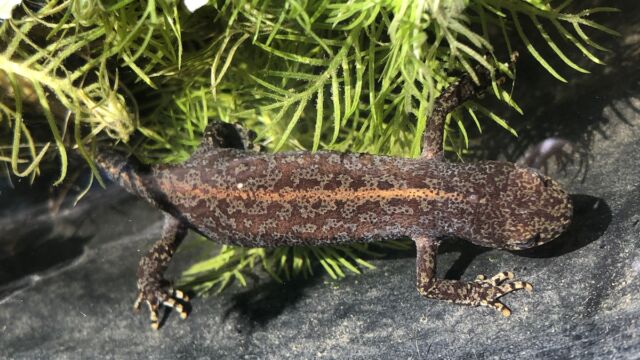 Eine Köcherfliegenlarve mit ihrem wunderbar gebauten Köcher. Die Larve einer Blaugrünen Mosaikjungfer und eine Bergmolch-Larve.
