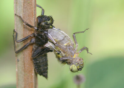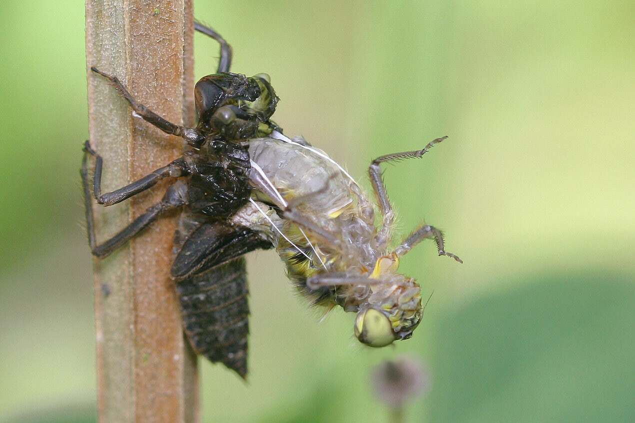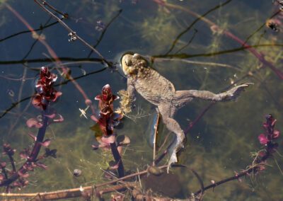 Unter der Wasseroberfläche geht es mindestens genauso geschäftig zu. Unzählige Wasserbewohner sind dort unterwegs und füllen den Teich mit Leben. Frösche, Molche und Kröten schwimmen umher oder liegen dicht unter der Oberfläche auf der Lauer nach einem kleinen vorbeifliegenden Happen. Während es schon spannend – und auch angenehm beruhigend – ist, den ausgewachsenen Tieren zuzusehen, so ist es jedes Jahr aufs Neue einfach faszinierend zu beobachten, wie den kleinen, schlicht geformten Kaulquappen mit zunehmender Grösse schliesslich Beinchen wachsen und sie nach und nach ihre «fertige» Form annehmen. Sie teilen sich ihren Lebensraum mit verschiedensten Insekten und Insektenlarven. Während Wasserkäfer, wie der Name schon sagt, im Wasser ihr Element haben, verbringen die Larven verschiedener Fluginsekten, wie z.B. Köcherfliegen und Libellen ihre gesamte Larvenzeit unter Wasser.